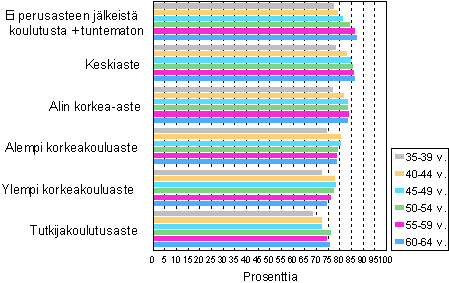 Lapsia saaneiden naisten osuus ikäryhmittäin eri koulutustasoilla 2004