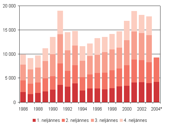 Maastamuutto neljännesvuosittain 1986 - 2004, 2. neljännes 2004