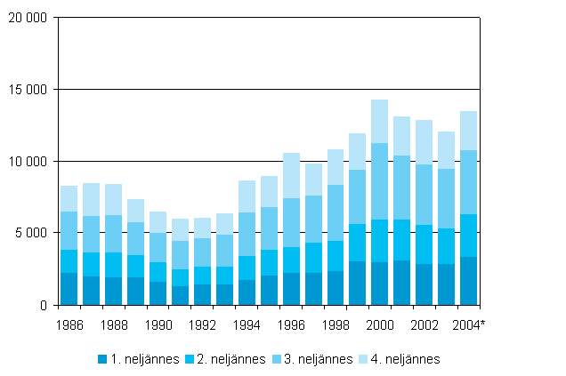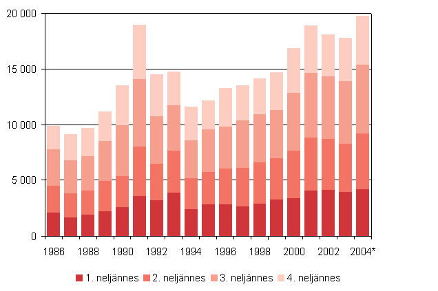 Maahanmuutto neljännesvuosittain 1986 - 2004, 4. neljännes 2004
