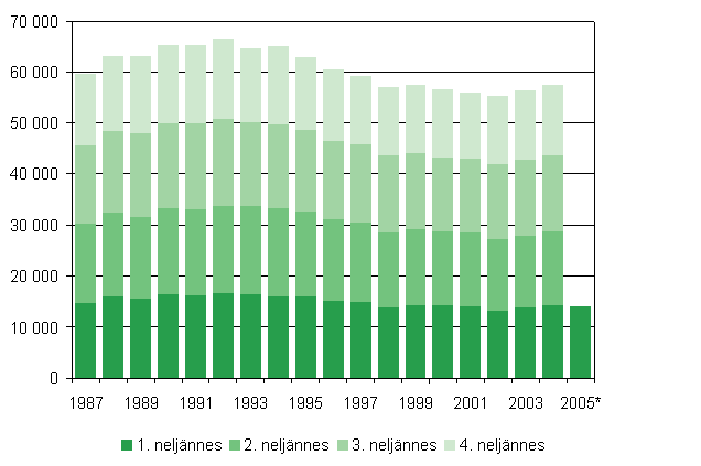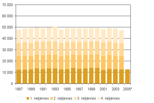 Elävänä syntyneet neljännesvuosittain 1987 - 2005, 1. neljännes 2005