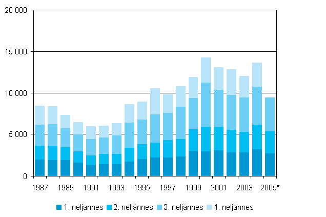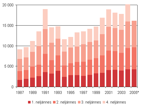 Maastamuutto neljännesvuosittain 1987 - 2005, 3. neljännes 2005