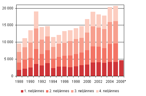 Maahanmuutto neljännesvuosittain 1988 - 2006, 1. neljännes 2006