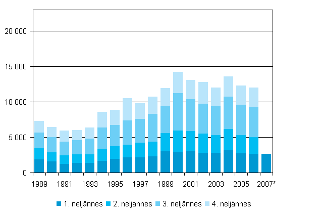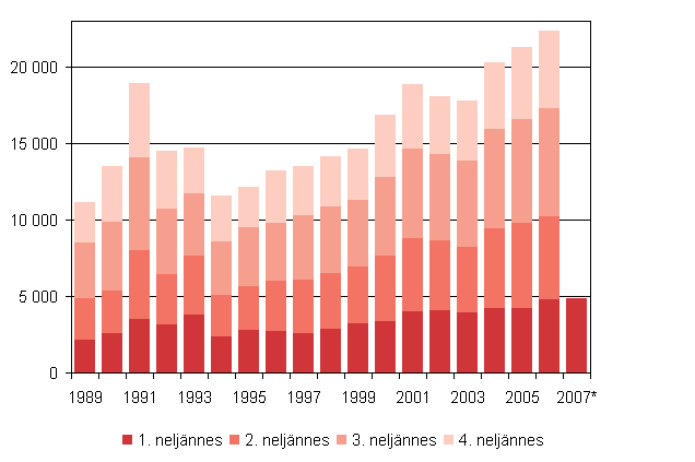 Maahanmuutto neljännesvuosittain 1989 - 2007, 1. neljännes 2007