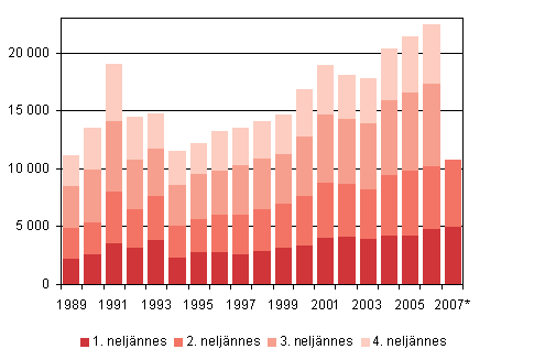 Maahanmuutto neljännesvuosittain 1989 - 2007, 2. neljännes 2007