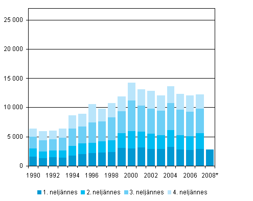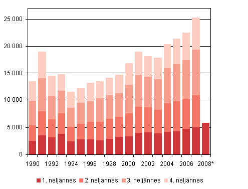 Maahanmuutto neljännesvuosittain 1990 - 2008, 1. neljännes 2008
