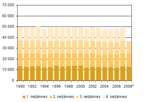 Elävänä syntyneet neljännesvuosittain 1990 - 2008, 3. neljännes 2008