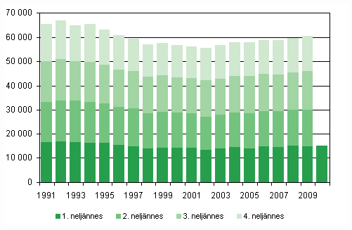 Kuolleet neljännesvuosittain 1991 - 2010, 1. neljännes 2010