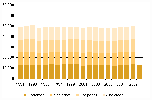 Elävänä syntyneet neljännesvuosittain 1991 - 2010, 1. neljännes 2010