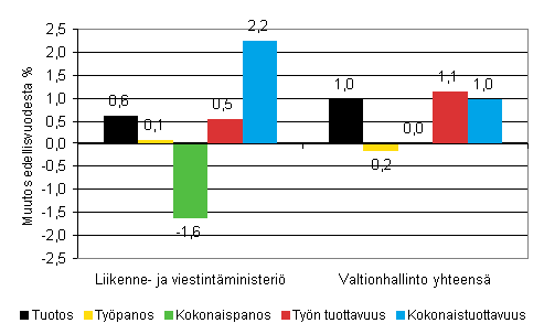 Tuottavuuskehitys liikenne- ja viestintäministeriön hallinnonalalla oli hyvää vuonna 2005. Kokonaistuottavuus parani 2,2 prosenttia, mikä ylittää valtion keskimääräisen tuloksen. Tuotoksen volyymi kasvoi maltillisesti väylävirastoissa ja nopeammin tutkimus ja hallintovirastoissa. Yhteensä kuluilla painotetuksi tuotosvolyymin kasvuksi tuli 0,6 prosenttia. Kokonaispanoksen voimakas lasku selittyy lähinnä väylävirastojen panoskäytön alenemisesta. Tuottavuuskehitys olikin seurausta panoskäytön alenemisesta.