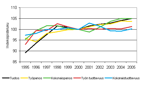 Valtion virastojen ja laitosten tuotoksen, tuotantopanosten ja tuottavuuden kehitys 1995-2005 (2000=100)
