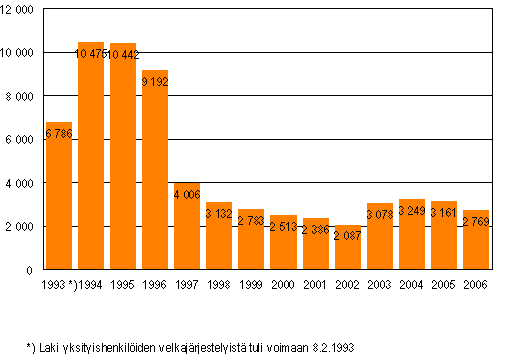 Tammi-syyskuussa 2006 jätettiin käräjäoikeuksiin 2 769 yksityishenkilöiden velkajärjestelyhakemusta, mikä on 392 vähemmän kuin vastaavana ajankohtana vuotta aiemmin.