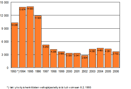 Vuoden 2006* aikana jätettiin käräjäoikeuksiin 3 702 yksityishenkilöiden velkajärjestelyhakemusta, mikä on 589 vähemmän kuin vastaavana ajankohtana vuotta aiemmin. Kaikkiaan yksityishenkilöiden velkajärjestelyhakemuksia on jätetty käräjäoikeuksiin lain voimaantulovuoden 1993 jälkeen yhteensä lähes 90 000.
