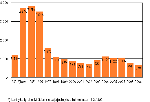 Tammi-maaliskuussa 2008 jätettiin käräjäoikeuksiin 678 yksityishenkilöiden velkajärjestelyhakemusta, mikä on 103 vähemmän kuin vastaavana ajankohtana vuotta aiemmin.