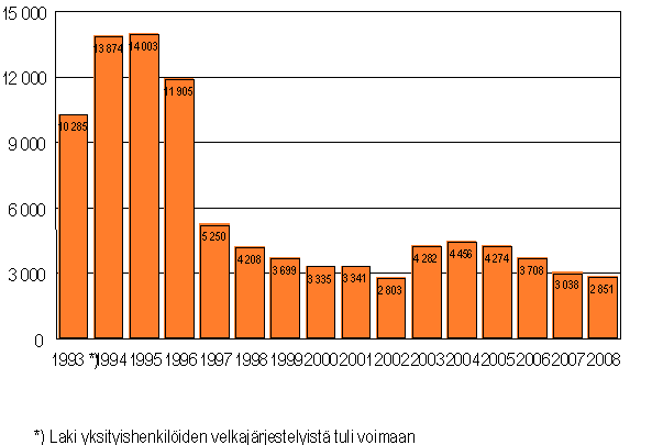 Vuoden 2008 aikana jätettiin käräjäoikeuksiin 2 851 yksityishenkilöiden velkajärjestelyhakemusta, mikä on 187 vähemmän kuin vastaavana ajankohtana vuotta aiemmin. Kaikkiaan yksityishenkilöiden velkajärjestelyhakemuksia on jätetty käräjäoikeuksiin lain voimaantulovuoden 1993 jälkeen yhteensä yli 95 000.