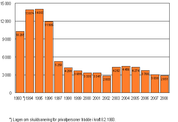 År 2008 lämnades 2 851 ansökningar om skuldsanering för privatpersoner till tingsrätterna, vilket är 187 färre än under motsvarande period året innan. Efter att skuldsaneringslagen trädde i kraft år 1993 har det totalt gjorts mer än 95 000 ansökningar om skuldsanering för privatpersoner.