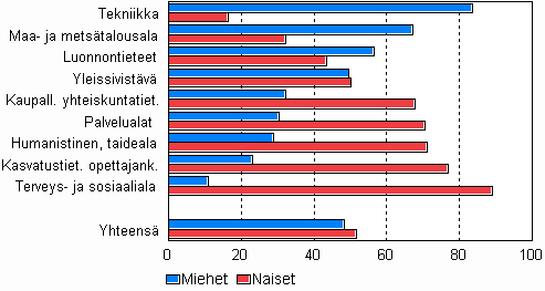 Perusasteen jälkeisen tutkinnon suorittanut väestö koulutusalan ja sukupuolen mukaan 2008