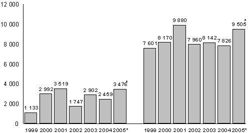 Korjaus 21.2.2006 ilmestyneeseen Valtion takauskannan tilastojulkistukseen. Luvut on korjattu otsikkoon, oheiseen tekstiin ja kuvioon.
