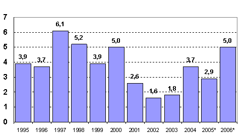 Growth was especially rapid in industry, where the volume of value added grew by 10.6 per cent. In the metal industry value added grew by over 15 per cent and in the paper industry by as much as 23 per cent due to the industrial dispute of the previous year. The volume of the value added of construction grew by 3.3 per cent. In private services value added grew by 4.7 per cent last year and in public services by 0.3 per cent. In primary production value added contracted by 0.7 per cent.