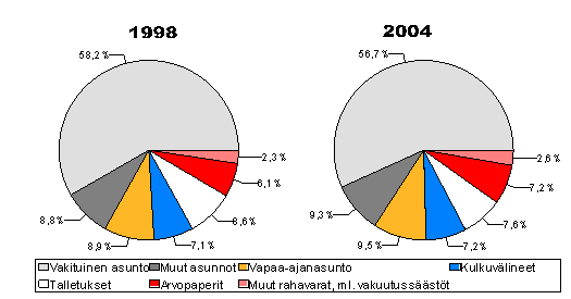Kotitalouksien varallisuuden rakenne oli samankaltainen kuin edellisenä tutkimusvuotena 1998 (kuvio 1). Reilusti yli puolet omaisuudesta oli oman, vakituisen asunnon arvoa. Omistusasunnon suuri osuus kuitenkin pieneni hiukan ja sijoitusomaisuuden lisääntyi. Kymmenessä vuodessa oman asunnon osuus on pudonnut 60,9 prosentista 56,7 prosenttiin. Vuodesta 1998 pudotusta oli 1,6 prosenttiyksikköä.