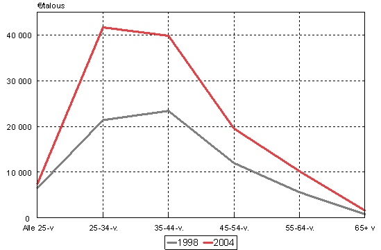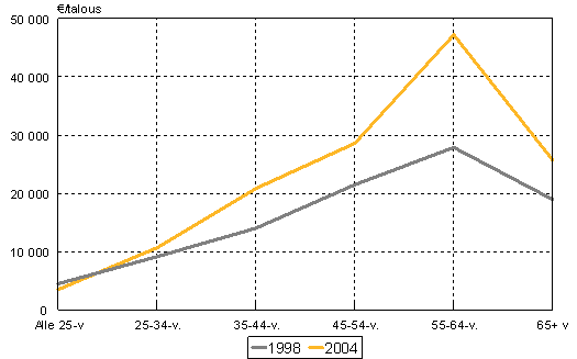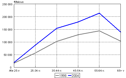 Kuvio 2 esittää bruttovarallisuuden keskimääräisen arvon ikäluokittain vuosina 1998 ja 2004. Ikäluokittainen varallisuusprofiili oli samankaltainen molempina tutkimusvuosina. Kuviosta näkyy, että euroina varallisuus kasvoi eniten eli noin 70 000 eurolla 55-64-vuotiaiden ikäluokassa. Tässä ikäluokassa elinkaarivarallisuus oli myös suurimmillaan. Nuorempien, 25-34-vuotiaiden, varat kasvoivat 31 000 eurolla ja 35-44-vuotiaiden 52 000 eurolla. Suhteellisesti kasvu oli näissä ikäluokissa suurempaa kuin 55-64-vuotiailla. Nuorempien varallisuutta kartuttivat erityisesti oma asunto ja auto tai muut kulkuvälineet.
