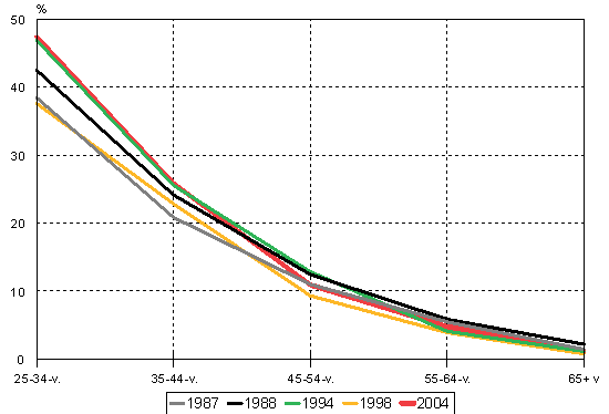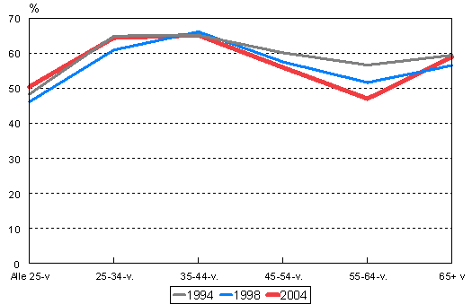 Oman asunnon osuus varallisuudesta muuttui melko vähän, vaikka asuntojen hinnat ovat viime vuosina pysytelleet korkealla. Oman asunnon osuus pieneni kuitenkin huomattavasti 55-64-vuotiailla. Heillä osuus pieneni kymmenkunta prosenttiyksikköä 56,7:stä 47,1 prosenttiin vuodesta 1994 vuoteen 2004 (kuvio 4).