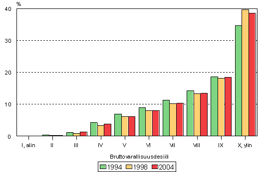 Kotitalouksien väliset varallisuuserot tasoittuivat hieman kuuden vuoden takaisesta tutkimuksesta. Varallisuuseroja voidaan tarkastella tuloerojen tapaan varallisuuskymmenysten eli desiilien avulla. Varakkain kymmenesosa talouksista omisti 38,5 prosenttia kaikesta varallisuudesta vuonna 2004. Vuoteen 1998 verrattuna varakkaimpien omistusosuus oli 1,2 prosenttiyksikköä pienempi (kuvio 8).