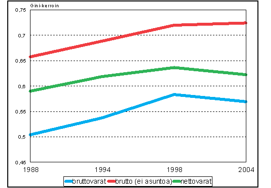 Kuvio 9. Gini-kertoimella mitattu varallisuuden jakautumisen epätasaisuus vuosina 1988, 1994, 1998 ja 2004