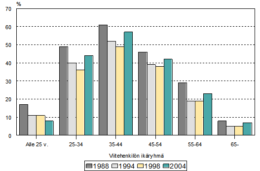 Asuntovelkaisten talouksien osuus (%) viitehenkilön ikäryhmän mukaan 1988-2004