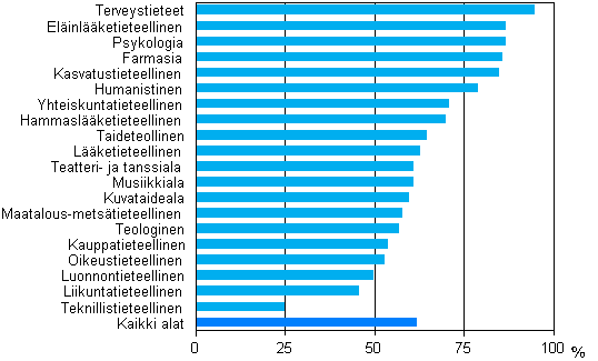 Naisten osuus tutkinnon suorittaneista opintoaloittain 2005