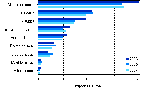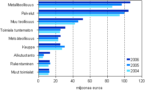 Toimialoittain tarkasteltuna eniten euromääräistä yritystukea vuonna 2006 saivat teollisuusyritykset, etenkin metalliteollisuus (TOL 27-35). Metalliteollisuusyrityksiä oli vuonna 2006 vajaat 11 000, reilut 4 prosenttia kaikista yrityksistä. Toimialan yrityksistä yritystukea sai vajaat 22 prosenttia. Palvelualat (TOL 55-74 ja 90-93) olivat yritystukien saajana suurin yritysten lukumäärällä tarkasteltuna. Palvelualojen yrityksiä oli vuonna 2006 vajaat 113 000, reilut 45 prosenttia kaikista yrityksistä. Toimialan yrityksistä yritystukea sai reilut 7 prosenttia.
