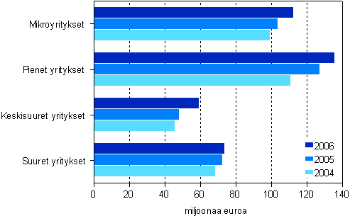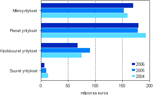 Maksetut suorat tuet yritysten suuruusluokittain1) 2004-2006, miljoonaa euroa