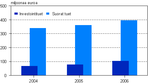 KTM:n investointitukien osuus kaikista maksetuista suorista tuista (KTM, MMM, Tekes ja TM) kasvoi ja oli vuonna 2006 noin 27 prosenttia.