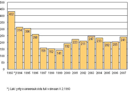Vireille pannut yrityssaneeraukset tammi-syyskuussa 1993-2007
