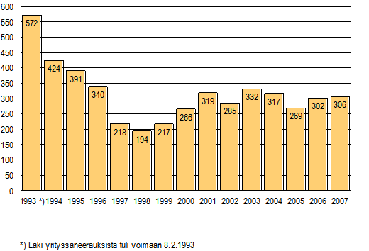 Vuoden 2007 aikana pantiin vireille 306 yrityssaneerausta, mikä on 4 enemmän kuin vuotta aiemmin. Henkilökunnan määrä vuonna 2007 yrityssaneeraukseen haetuissa yrityksissä oli kaikkiaan 2 565, mikä on 758 enemmän kuin edellisenä vuonna.