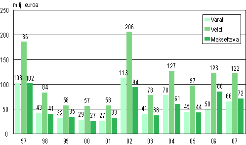 Varat ja velat sekä maksettavaksi määrätyt summat yhteensä vuosina 1998-2007 vahvistetuissa yrityssaneerausohjelmissa