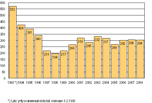 Vuoden 2008 aikana pantiin vireille 304 yrityssaneerausta, mikä on 2 vähemmän kuin vuotta aiemmin. Henkilökunnan määrä vuonna 2008 yrityssaneeraukseen haetuissa yrityksissä oli kaikkiaan 3 088, mikä on 523 enemmän kuin edellisenä vuonna.
