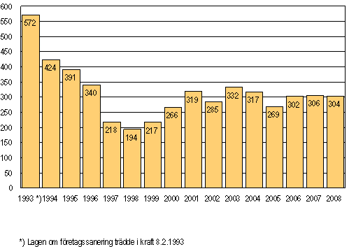År 2008 anhängiggjordes 304 företagssaneringar, vilket är 2 färre än året innan. Antalet anställda i de företag som ansökte om företagssanering var totalt 3 088, vilket är 523 fler än året innan.
