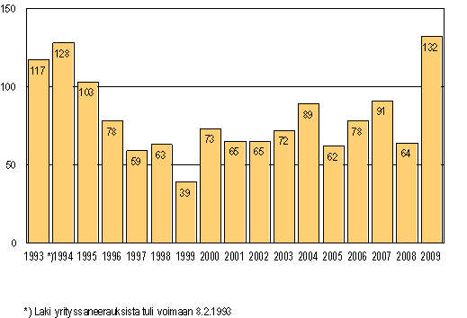 Vireille pannut yrityssaneeraukset tammi-maaliskuussa 1993-2009