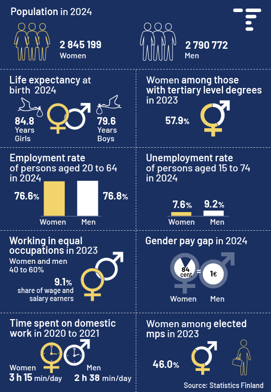 - Total working hours of women and men on the same level for the first time in 2020 to 2021 (Statistics Finland 10 Nov 2022)