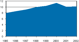Mallisuojaintensiivisten toimi-alojen osuus bkt:sta 1995-2002