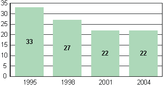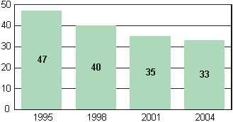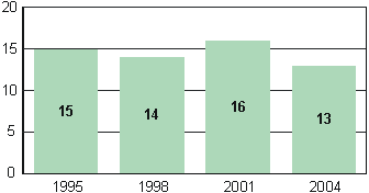 Lähde: Kivivuori Janne ja Salmi Venla: Nuorten rikoskäyttäytyminen 1995-2004, Oikeuspoliittinen tutkimuslaitos, 2005.