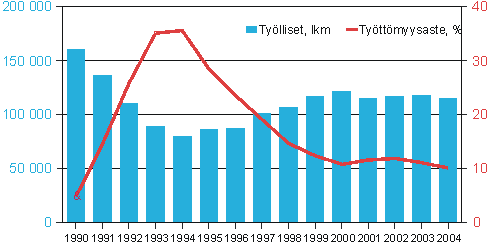 Kuvio 1. Talonrakennusalan työllisten määrä ja työttömyysaste 1990-2004