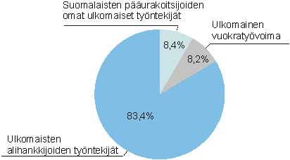 Ulkomaalaisten työntekijöiden osuus on selvästi suurempaa Uudellamaalla kuin muualla maassa. Pääosa ulkomaalaisista on aliurakoitsijoiden työntekijöitä. Vuokratyövoimasta ulkomaalaisten suhteellinen osuus on suuri, mutta määrällisesti vuokrattua työvoimaa on vähemmän kuin aliurakoitsijoiden työvoimaa. Pääurakoitsijoiden omista työntekijöistä ulkomaalaisia on erittäin vähän (kuvio 2).