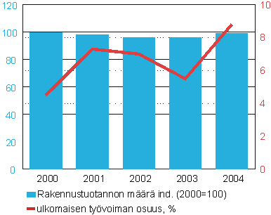 Näyttää siltä, että ulkomaalaisten työntekijöiden laskennallinen osuus olisi seurannut rakentamisen suhdanteita 2000-luvulla. Ulkomaalaisten työntekijöiden työpanos väheni suhdannetaantuman vuosina 2001-03, kun rakentaminen kääntyi lievään laskuun. Vuonna 2004 ulkomaalaisten työpanos taas alkoi kasvaa, kun rakentaminen on alkanut vilkastua (kuvio 3).