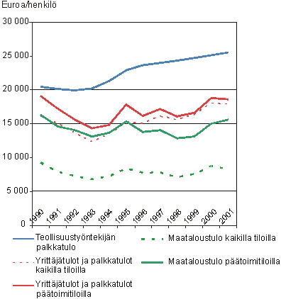 Henkilöä kohti laskettu päätoimitilojen maataloustulo oli 1980-luvun lopulla ja 1990-luvun alkupuolella 65-80 prosenttia teollisuustyöntekijän palkkatulosta. Tämän jälkeen teollisuudessa on jatkunut palkkatulojen nouseva kehitys, mutta maatalouden tulot ovat vaihdelleet tuotanto-olosuhteista riippuen. Vuonna 2001 päätoimitilojen maataloustulo oli 61 prosenttia teollisuustyöntekijän palkkatulosta. Päätoimitilojen ansiotulot (eli maa- ja metsätalouden tulot, muut yrittäjätulot sekä palkkatulot yhteensä) olivat 73 prosenttia teollisuustyöntekijän palkkatuloista (Kuvio 4).