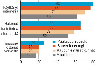 Internetiä käytettiin edelleen aktiivisemmin pääkaupunkiseudulla kuin muissa suurissa kaupungeissa (Turku, Tampere, Oulu, Kuopio, Jyväskylä, Lahti ja Pori) tai muualla Suomessa. Pääkaupunkiseudulla asuvista 15-74-vuotiaista 80 prosenttia oli käyttänyt Internetiä haastattelua edeltäneiden kolmen kuukauden aikana. Internetin käyttäjämäärät ovat kuitenkin kasvaneet kaikilla alueilla.