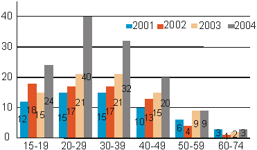 Kuvio 2. Verkkokaupan käyttäjien osuus koko ikäryhmästä keväällä 2001, 2002, 2003 ja 2004, %