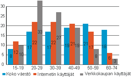 Keväällä 2004 verkon kautta jotain ostaneista tai tilanneista 70 prosenttia oli iältään alle 40-vuotiaita. Erityisen nopeana verkkokaupan käyttäjien osuuden kasvu on alkuvuonna jatkunut 20-29-vuotiaiden ikäryhmässä (kuvio 2). Yli 50-vuotiaiden osuus verkkokaupasta on pysynyt ennallaan, vaikka heidän osuutensa Internetin käyttäjistä onkin hieman kasvanut. 50-74-vuotiaiden osuus kaikista verkko-ostoksilla käyneistä oli 11 prosenttia. (Kuvio 3). 50 vuoden ikä näyttää yhä olevan selkeä rajapyykki verkko-ostoksilla käymisen suhteen.