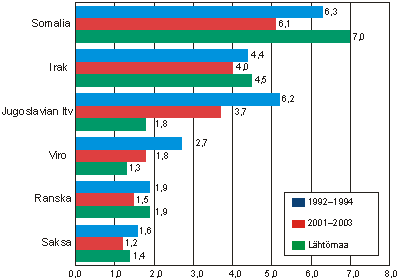 Suomessa asuvan muutaman ulkomaan kansalaisuus-ryhmän kokonaishedelmällisyys vuosina 1992-1994 ja 2001-2003 sekä lähtömaassa uusimman tiedon mukaan
