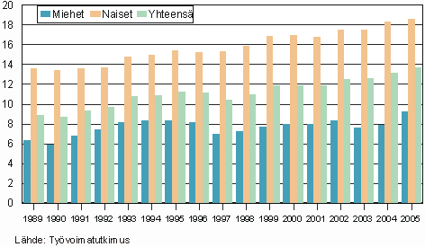 Kuvio 1. Osa-aikaisten osuus palkansaajista sukupuolen mukaan 1989 - 2005 (%)